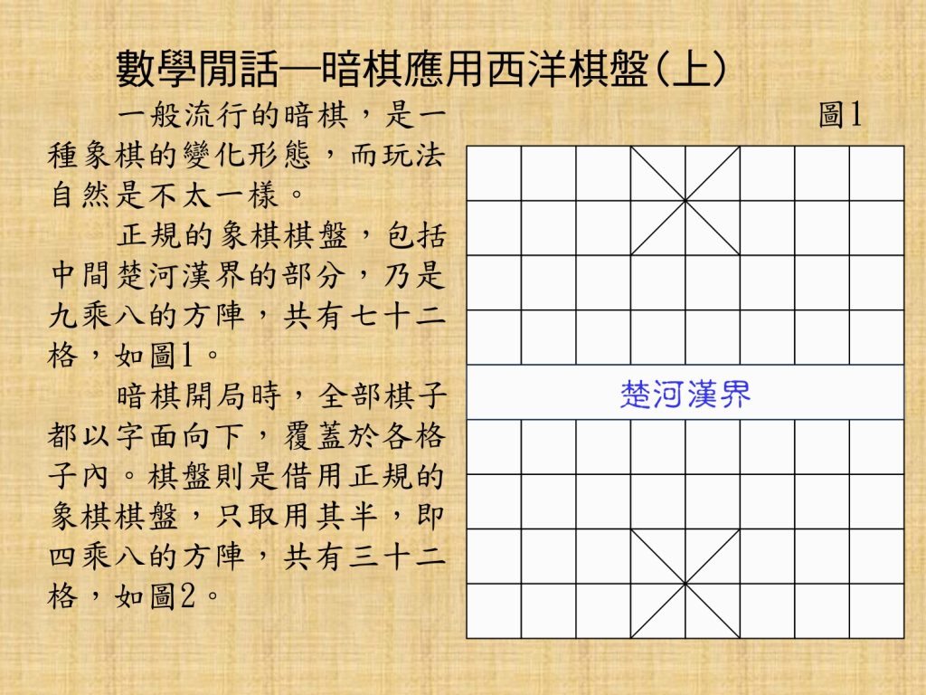 校友投稿 田銘莒(電工78):數學閒話―暗棋應用西洋棋盤(上) 2025-09-19 上一篇: 洪瑞浩(控制61):看重銀髪族的需要和商機 下一篇: 田銘莒(電工78):數學閒話―暗棋應用西洋棋盤(下)