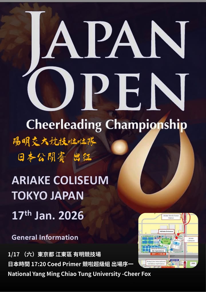 賀!陽明交大競技啦啦隊勇奪全國大專啦啦隊錦標賽團體組季軍 1/17 首度赴日征戰日本公開賽