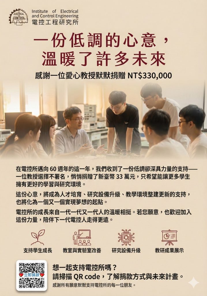在 AI 與高科技快速演進的時代,電控所肩負培育具備全球競爭力科技人才之使命。每一份支持,都是推動電控學子在學習、研究與創新道路上前行的重要力量。