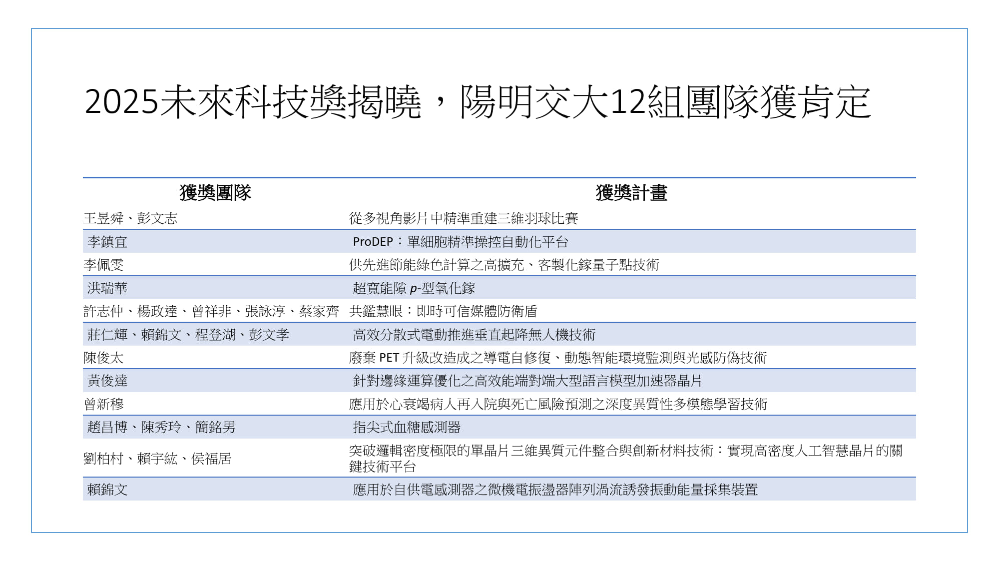 校園校友動態 2025-09-19 2025 陽明交大秋冬藝術季9月登場 「2025 陽明交大秋冬藝術季」首場活動已於 9 月 8 日登場,由盧俊翰《燦爛的戲劇性》個人畫展揭開序幕。其展出的作品以幾何結構與鮮明色彩交織,將山海風景視為 (...繼續閱讀) 2025-09-19 恭賀!莊人祥校友 (醫學系81級/公衛所83級)榮陞衛生福利部常務次長 恭賀本校醫學系81級、公共衛生研究所83級校友莊人祥,奉派出任衛生福利部常務次長。行政院於8月27日公布「AI行動內閣2.0」人事案,莊校友自疾管署署長轉任新職 (...繼續閱讀) 2025-09-19 恭賀!徐德福校友(醫學系83級/急重症所98級) 榮陞衛生福利部金門醫院院長 恭賀本校醫學系83級、急重症醫學研究所98級校友徐德福出任衛生福利部金門醫院院長。徐院長已於9月4日假衛生福利部舉行宣誓典禮,由衛生福利部部長石崇良親自主持,典 (...繼續閱讀) 2025-09-19 漢民科技創辦人黃民奇捐12億元 建置台北榮總BNCT中心 漢民科技創辦人暨董事長黃民奇斥資新台幣12億元,捐贈國立陽明交通大學「國產國造全系統設計加速器型硼中子捕獲治療設備」,並協助建置台北榮總「硼中子捕獲治療中心」。 (...繼續閱讀) 2025-09-19 賀!2025未來科技獎 陽明交大 12件技術獲獎 由國科會攜手中研院、教育部及衛福部共同舉辦的「2025 未來科技獎」揭曉!本屆廣徵我國最具潛力的學研成果,涵蓋人工智慧應用、半導體光電與通訊科技、先進材料與化工 (...繼續閱讀) 共 85 頁« 1 2 3 4 ... 85 »